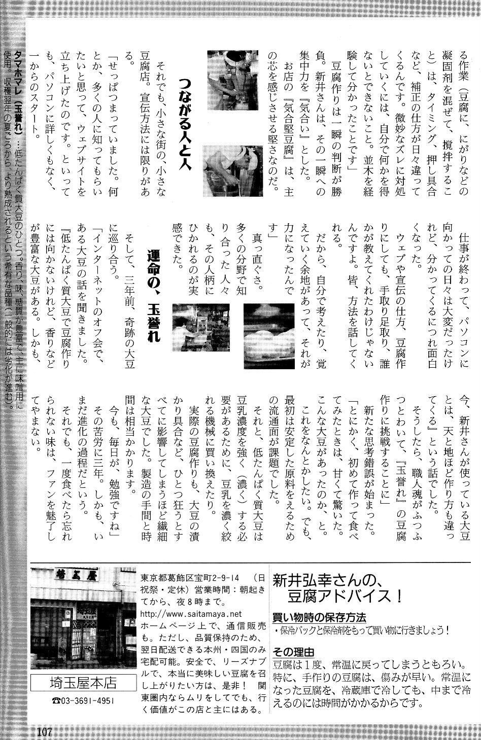 2003年9月 「寿」という冊子の10月号に掲載されました。 「食の快楽」というコ−ナ−に紹介されました。熱い思いが伝わってくるようなライタ−さんに出会い私も感激です。とても上手に載っていますので是非ご覧下さいませ〜 (ライタ−兼カメラマンさん、取材とは別に写真撮影には早朝より来店下さいました。お疲れ様でした。ありがとうございます。) |