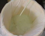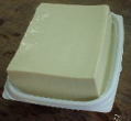 | 豆乳です。鶯色でして舐めた所、とても甘かった。 | 目が黒いのでおからはこんな感じです。 | にがり100%の絹豆腐です。 |