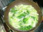 葉も加えて炒め合わせ、塩小さじ1弱、酒大さじ1をふり、水120cc、とりがらス−プの素を加える。
